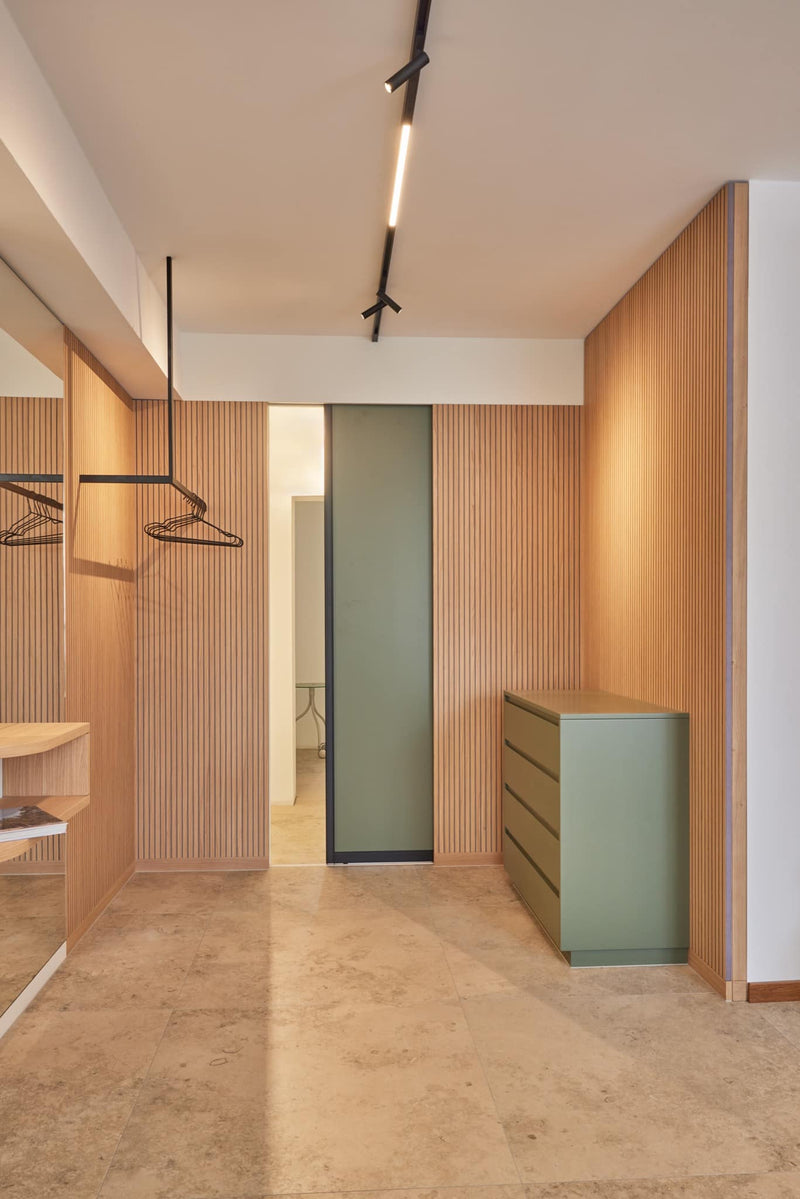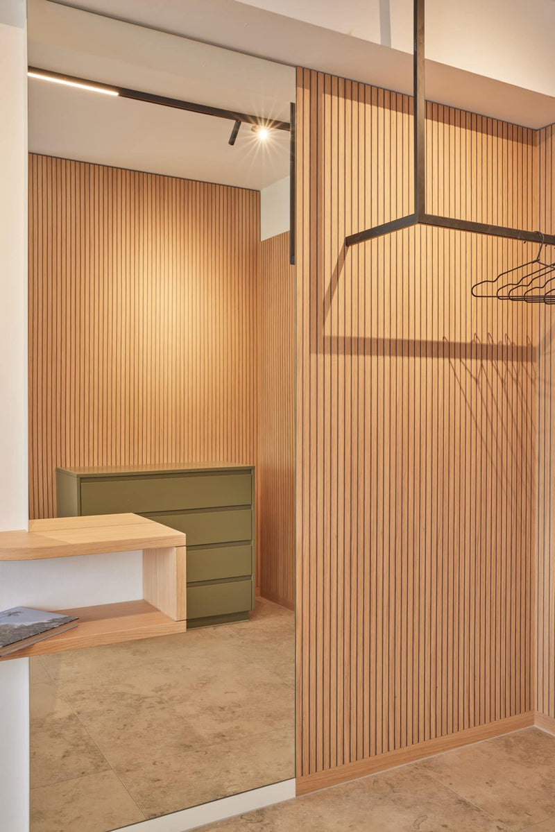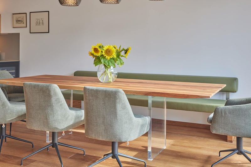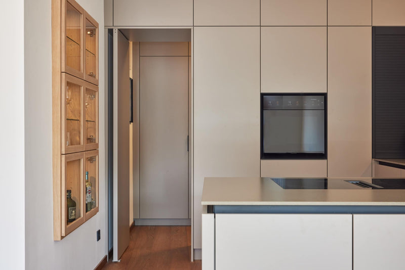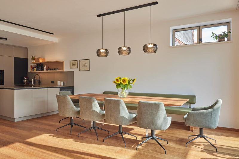 Renovierung eines Altstadthauses in Bad Radkersburg: Raumhohe Flügelglastüren trennen und verbinden zugleich Wohnraum, Küche und Esszimmer. Sie schaffen fließende Übergänge und erlauben flexibles Wohnen zwischen Offenheit und Privatheit. Warme Farbtöne in Kombination mit Naturholz bilden den ruhigen Rahmen, der ausgewählten Möbeln und der Kunstsammlung des Eigentümers Raum zur Entfaltung gibt.
