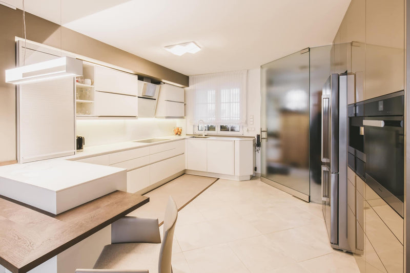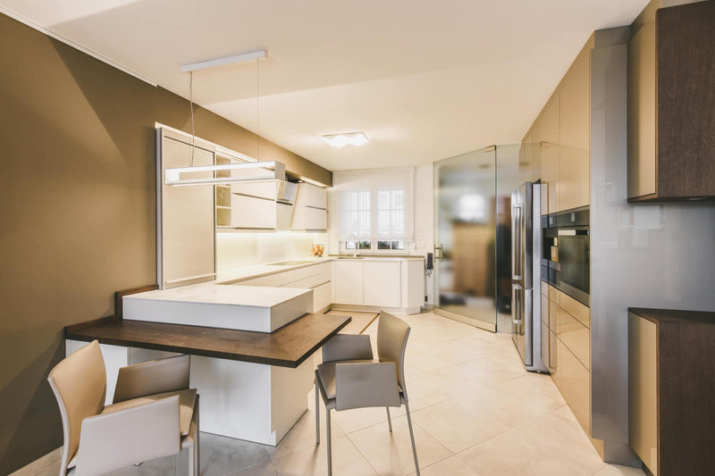 Praktisch und ästhetisch sollte die Küche dieses Hauses werden. Wir haben sie großzügig angelegt, mit einer matt-weißen Lackfronten und einer starken Keramikplatte. In Kombination mit grau-beigen Hochschränken ergibt sich eine klare, helle Atmosphäre. Um das Weiß noch stärker hervorzuheben wurde eine dunkle Wandfarbe gewählt, die an die Möbel im Wohnzimmer anschließt.