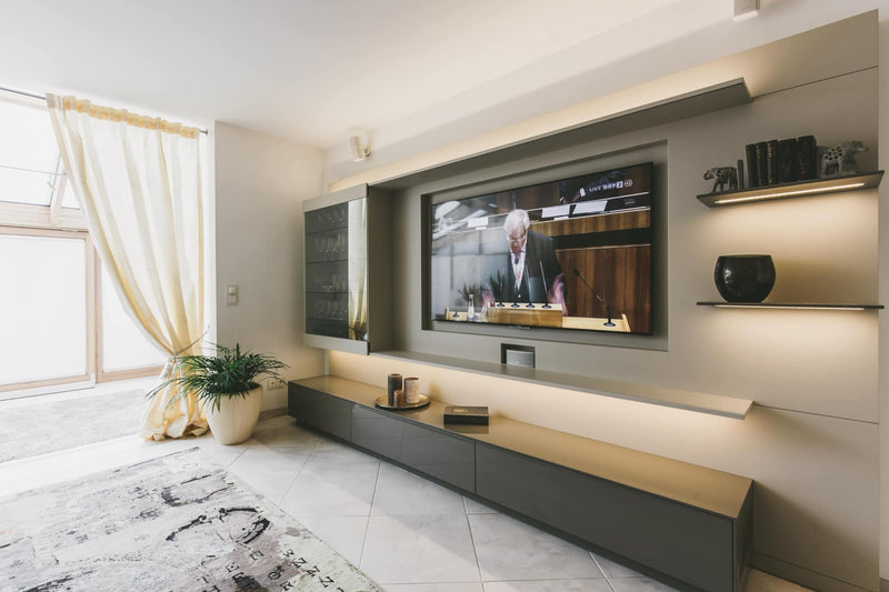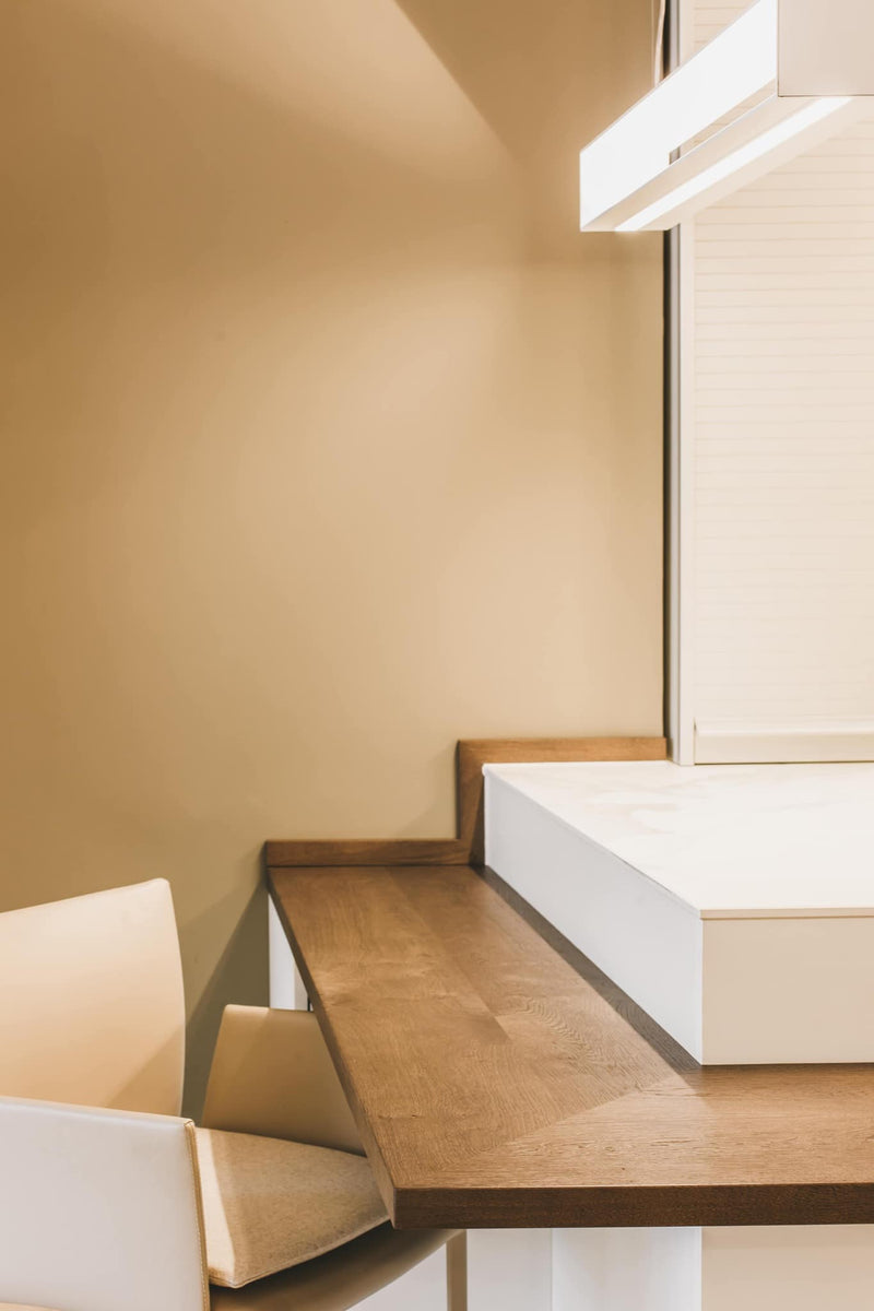 Als Verbindung der beiden Bereiche dient ein Tisch mit einer satten dunklen Eichenplatte. Die eigene Ausstrahlung der Wohnung entsteht durch die klug gesetzte, indirekte Beleuchtung. Sie ist immer direkt in die Möbel integriert und hüllt so alle Bereiche in ein wohliges, warmes Licht.