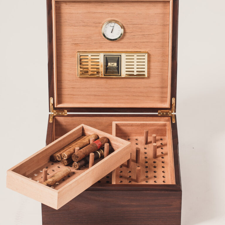 Im Double Tray finden problemlos 50 bis 80 Zigarren Platz und bleiben lange frisch und aromatisch. Dafür sorgen Befeuchter, analoger Hygrometer und die Innenauskleidung aus Zedernholz, welches vor allem vor Schädlingen schützt. Steckbolzen machen die Trays flexibel nutzbar, unter dem sich außerdem noch reichlich Stauraum befindet.